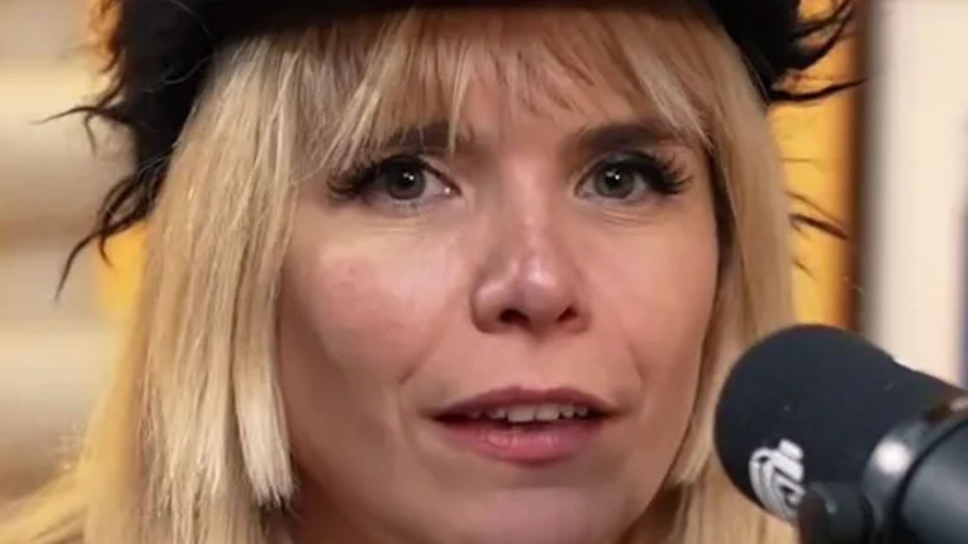 Collage of a man and a woman laughing into microphones during a podcast.