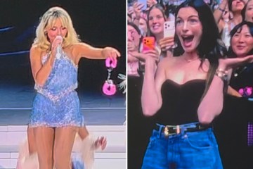 Anne Hathaway ‘apprehended’ by Sabrina Carpenter with fuzzy pink handcuffs in New York City
